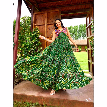 Style: Authentic Gujarati navratri lehenga choli with vibrant tie-dye patterns and intricate borders.